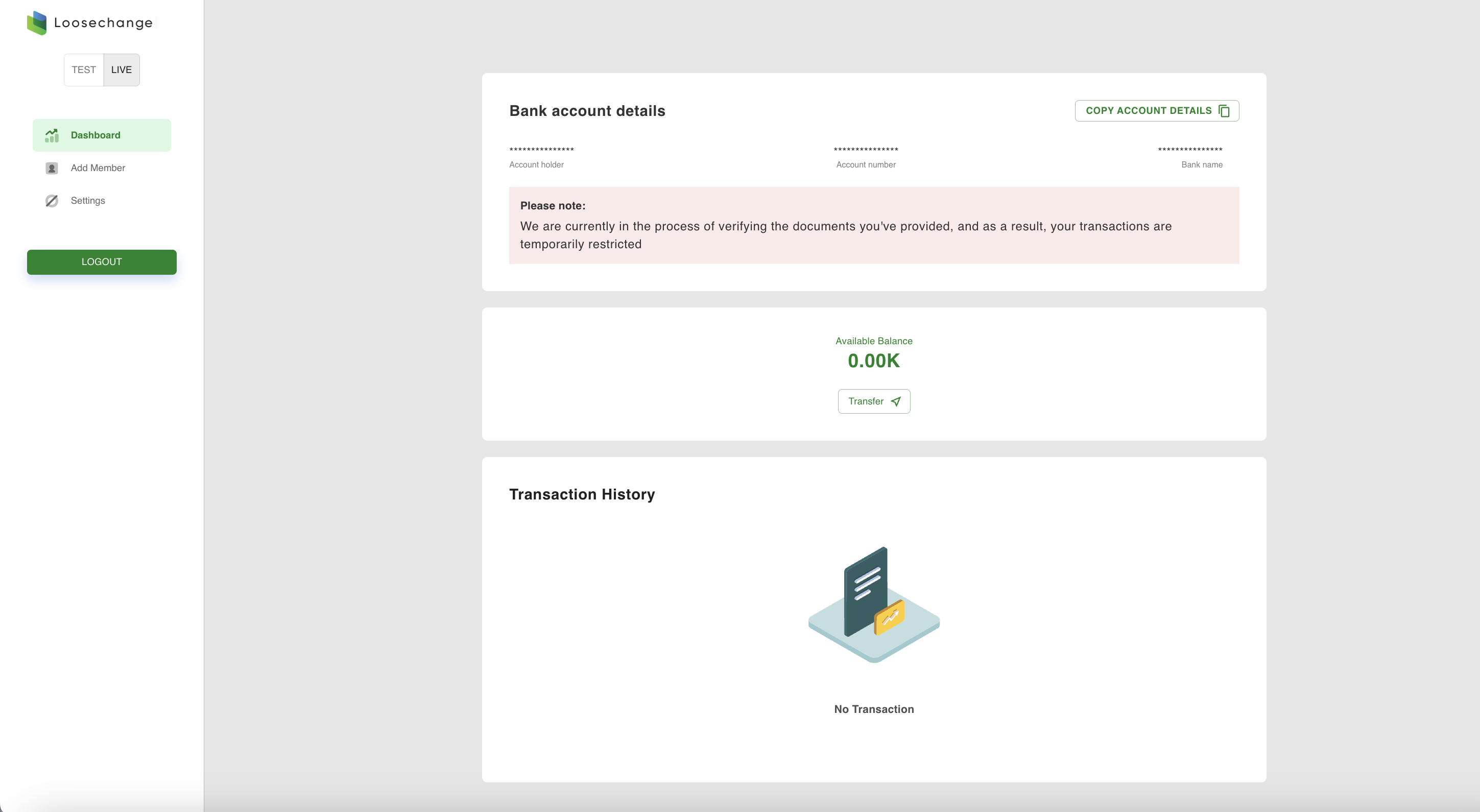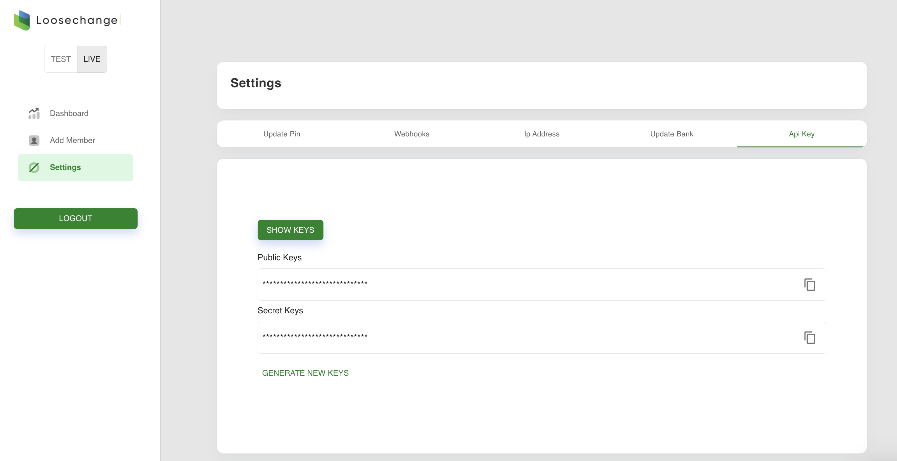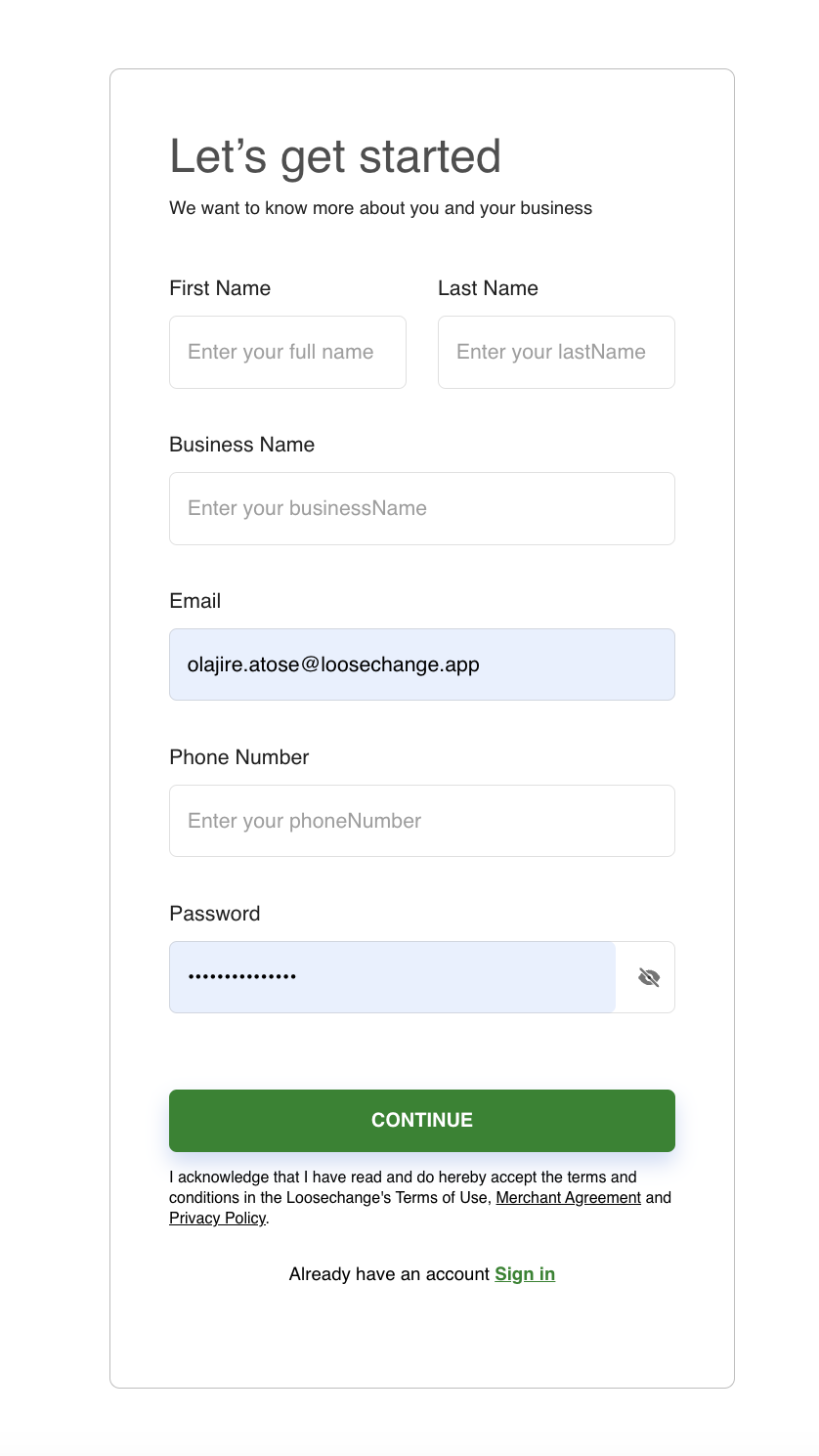 sign up for an account if not done so yet. For testing purpsoses, [signup here] -> (https://sandbox.loosechange.app)